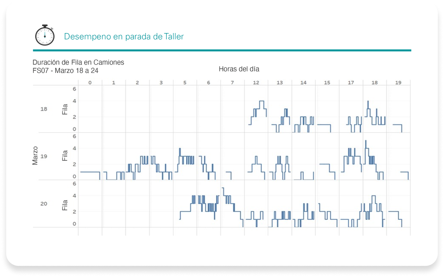 Los tiempos promedio de espera en los puntos estudiados eran de 3.3 minutos, dentro de un rango que iba desde los 20.3 minutos hasta los 0 minutos, en 3 puntos distintos a lo largo del día. Los diagramas de las filas de espera demostraron que existían distintas oportunidades para reducir las filas de camiones al: mejorar la distribución de las asignaciones de reabastecimiento a lo largo del turno; aumentar la utilización de los puntos de abastecimiento asignando camiones en las horas inactivas; aumentar la capacidad (i.e. rango de flujo) en puntos con alta demanda.