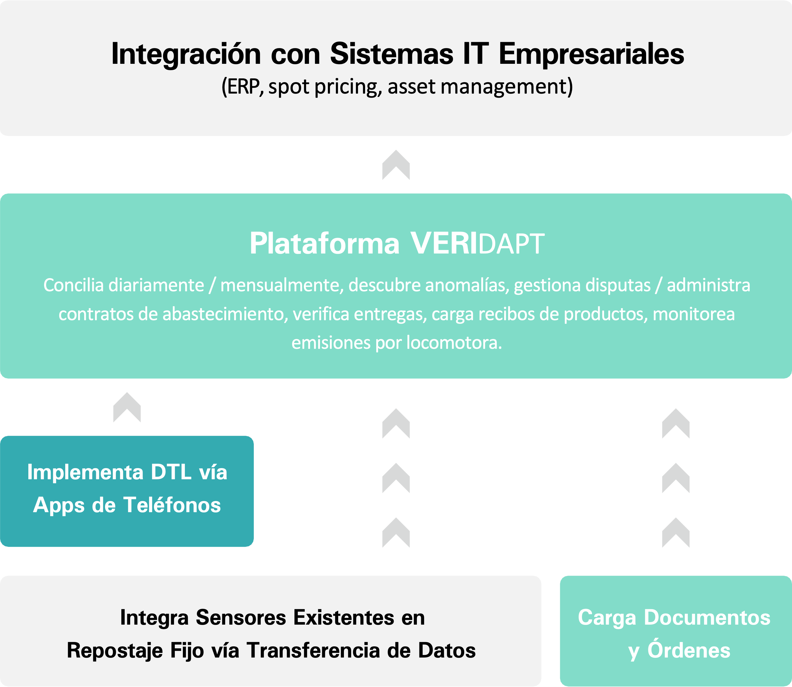 VERIDAPT verifica entregas y dispensaciones de combustible que se abastecen a través de tuberías, camiones cisterna, vagones, o Directo a la Locomotora, todo en tiempo real.
