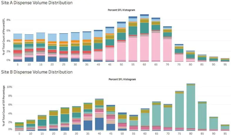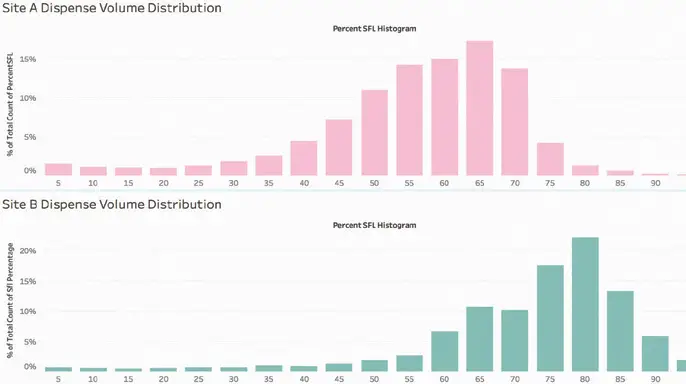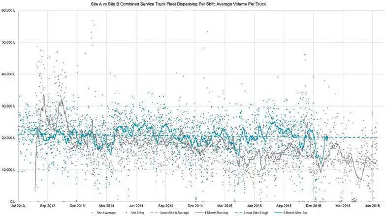 Figure 6, for instance, compares mine fuel service truck dispensing per shift between two similar sites run by the same company. This indicates that refueling productivity has decreased over time at one mine site while it is maintained at another site. Acting on this data can substantially improve productivity and reduce the required service trucks and operators.