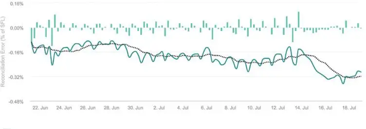 As flow meter error drifts in one direction, there will typically be a gradual trend in one direction (this can be complicated when multiple outflow meters are connected to a tank). Any large spikes or an increase in the rate of change can indicate a problem that may impact accurate reconciliation.