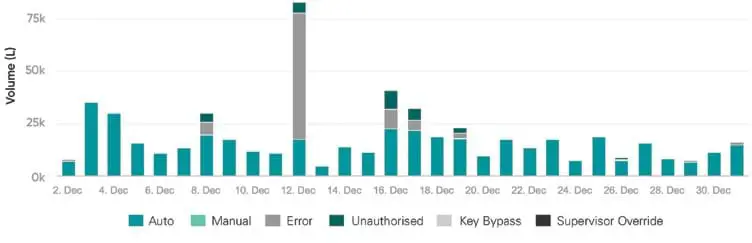 Higher columns to the right indicate that the sites were filling up more of the tanks’ capacity per transaction. The colours in the stacked column represent different categories of equipment. Values over 100 indicate whether the equipment was overfilled or incorrectly set up in the equipment profile. The large green bar for site A was an incorrectly configured equipment class.