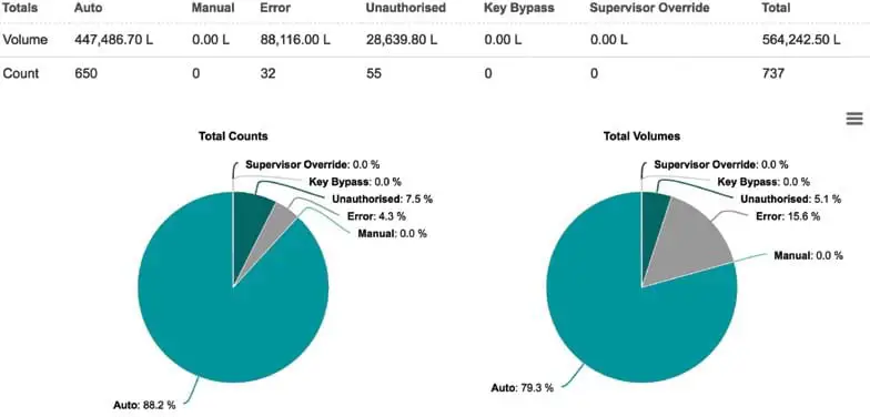 The large count of unauthorised transactions (2.4%) with a smaller corresponding volume (0.5%) indicates that many small volumes are being created outside of an open transaction. Commonly, this is due to meter rattle (the meter vibration and sending pulses the system picks up as flow, solved by using quadrature meters) or small volumes generated on pump start-up or after a transaction has closed. Once diagnosed, these can be resolved. There is also 1% of error transactions, indicating an issue with the flow measurement hardware. The next step is to determine the locations.