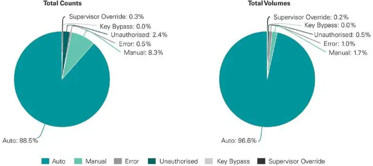 The corresponding values for manual transactions were 8.3% and 1.7%. The reason for the larger manual transaction-to-volume ratio is that most manual transactions were smaller oil and coolant transactions in the workshop that were performed manually, as well as light vehicle transactions for non-tagged vehicles.