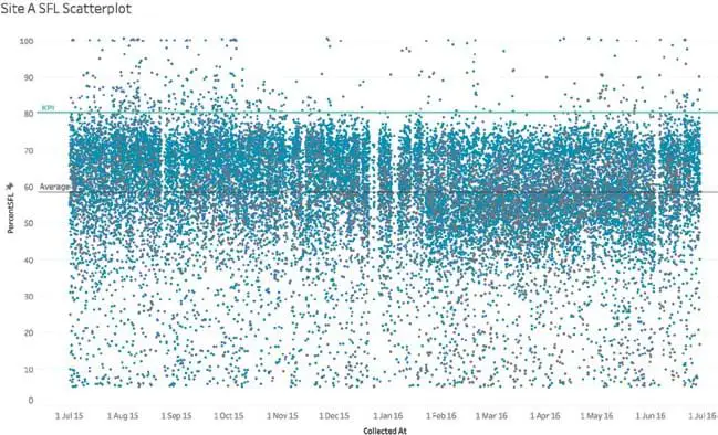 Figure 9 shows refuelling as a percentage of SFL for a haul truck fleet as a scatter plot, with each dot representing a refuelling transaction and each colour a model. Transaction volumes below 5% have been excluded. A data point at 100 indicates the tank was empty when refuelled. A data point of 50 suggests the tank was half full. The average remaining tank capacity was over 40%, and the green line represents a 20% capacity remaining KPI when refuelled. 24,000 transactions were analysed.