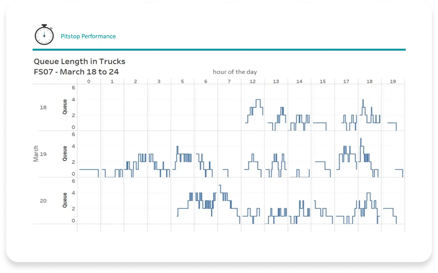 Average waiting times at the studied refueling points was 3.3 minutes, ranging from 20.3 minutes to 0 minutes, over 3 different pits over one day. The queue diagrams demonstrated that there were several opportunities to reduce the truck queue by: better distribution of assignments to refuelling across the shift; increase fuel locations utilisation by assigning trucks during idle hours; increase capacity (ie. flow rate) at highly utilised locations.
